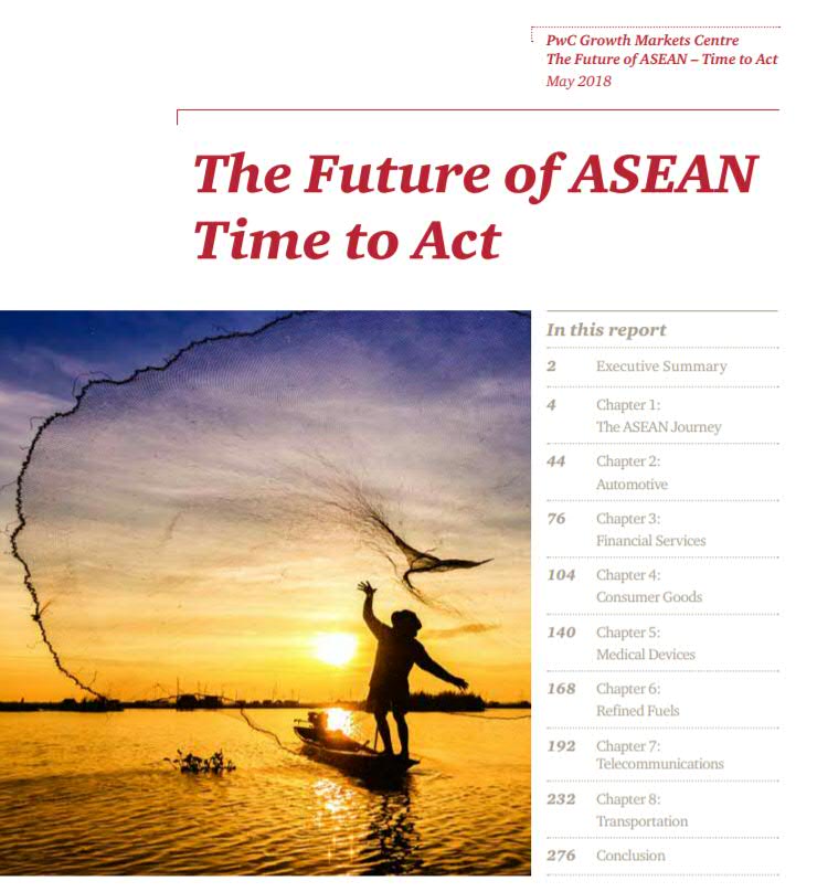 PwC’s Growth Markets Centre’s (GMC) annual report, The Future of ASEAN – Time to Act presents a view of the policies ASEAN governments ought to adopt to ensure their countries continue to mature, and a set of innovative strategies that companies from the automotive, financial services, consumer goods, medical devices, refined fuels, telecommunications and transportation sectors ought to develop and execute to achieve their regional growth ambitions.